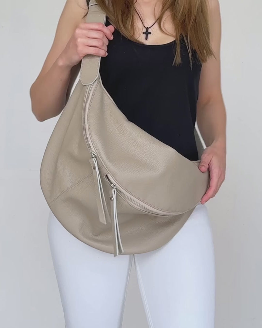Large Beige Leather Sling Bag - Oversized Fanny Pack