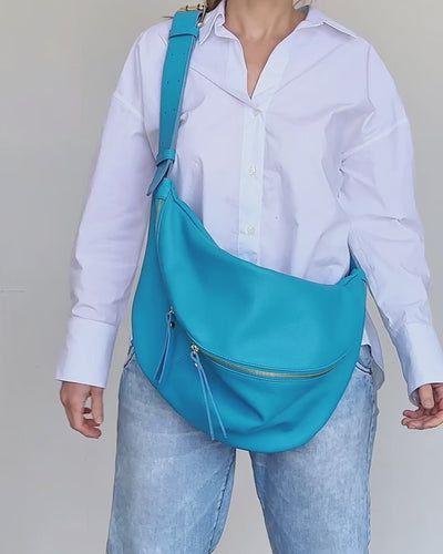 Large Blue Leather Sling Bag - Oversized Fanny Pack