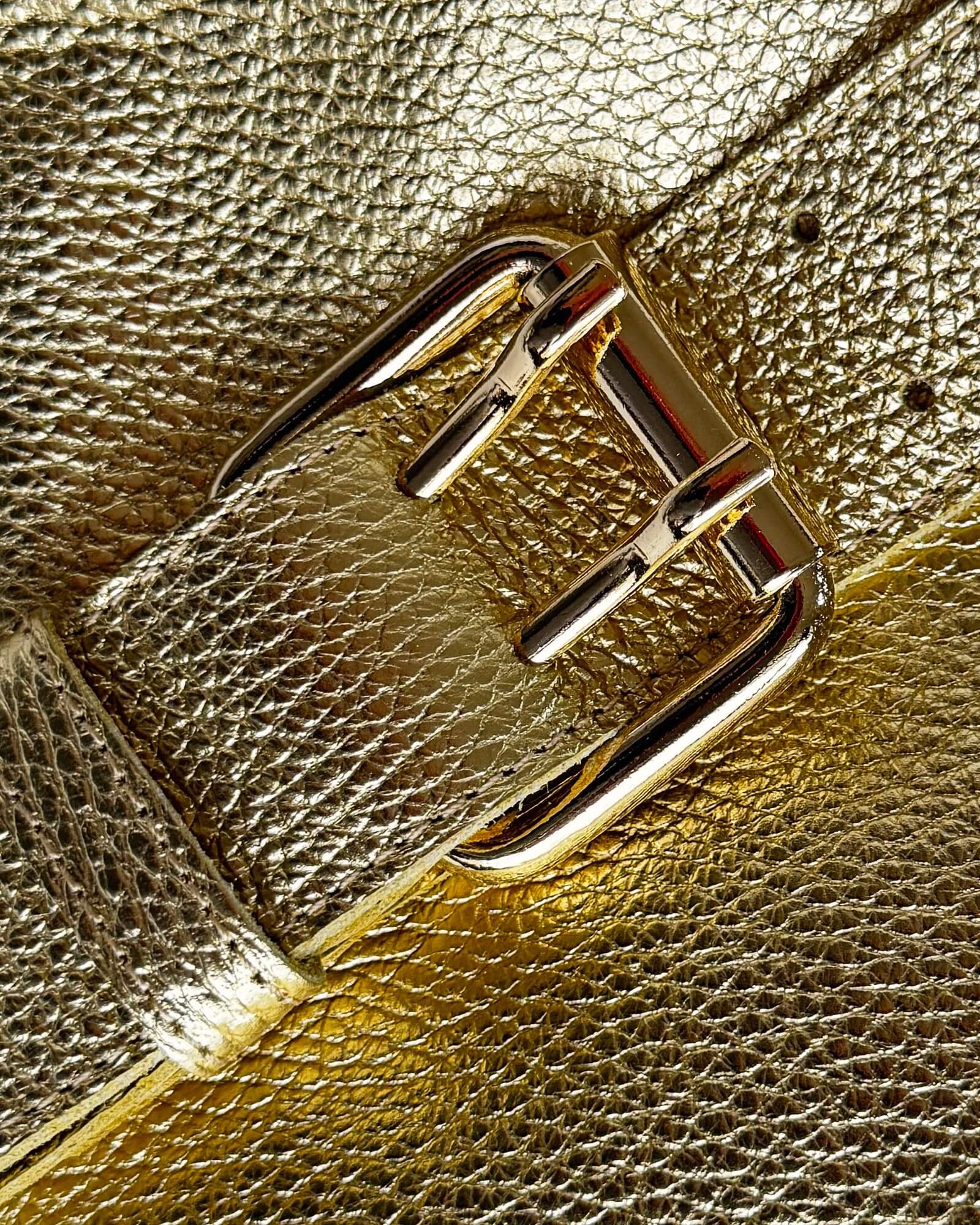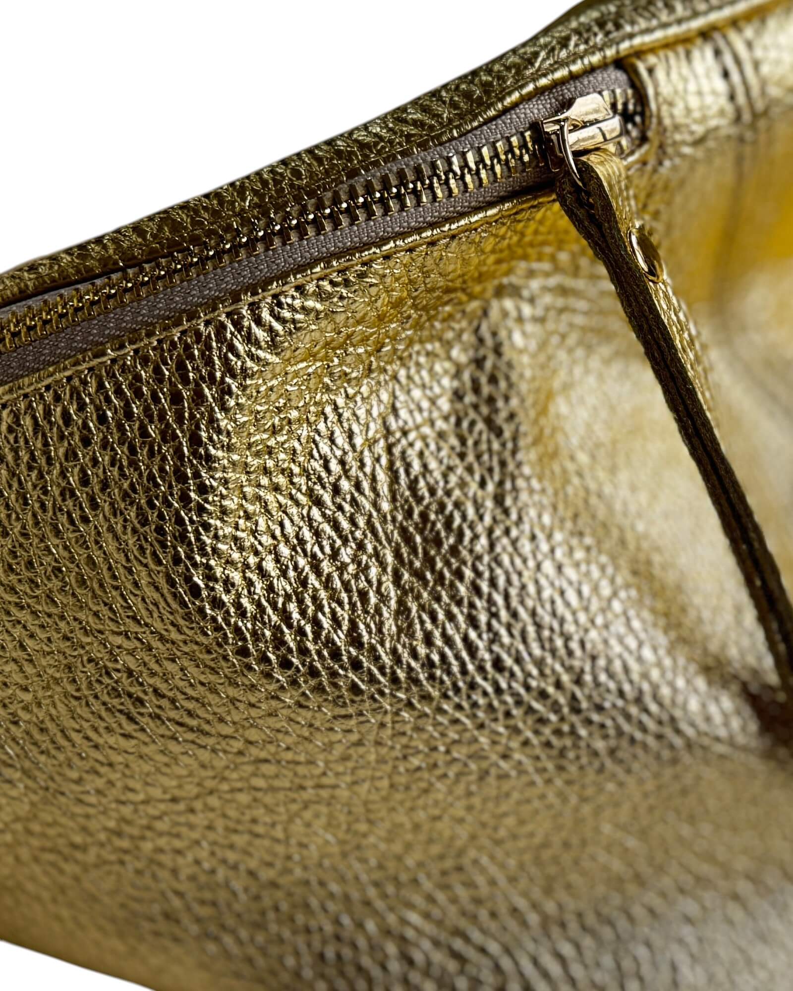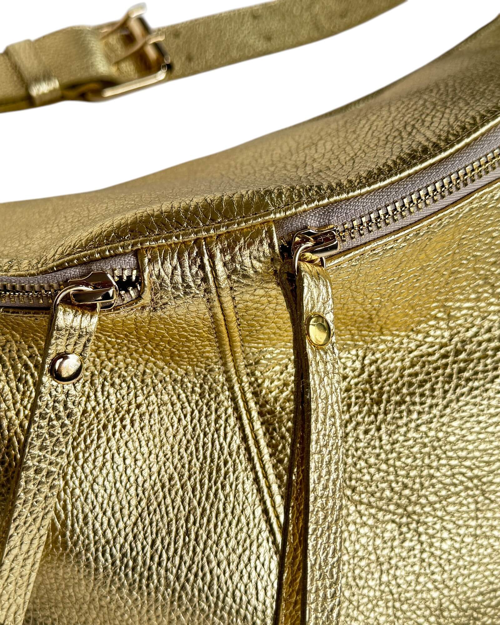 A slouchy, soft oversized leather sling bag with a metallic gold finish. Crafted from Italian pebbled leather, this large fanny pack offers generous space and hands-free ease for travel and city strolls.