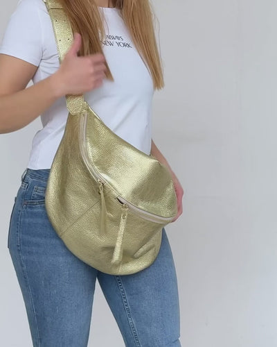 Large Metallic Gold Leather Sling Bag - Oversized Fanny Pack